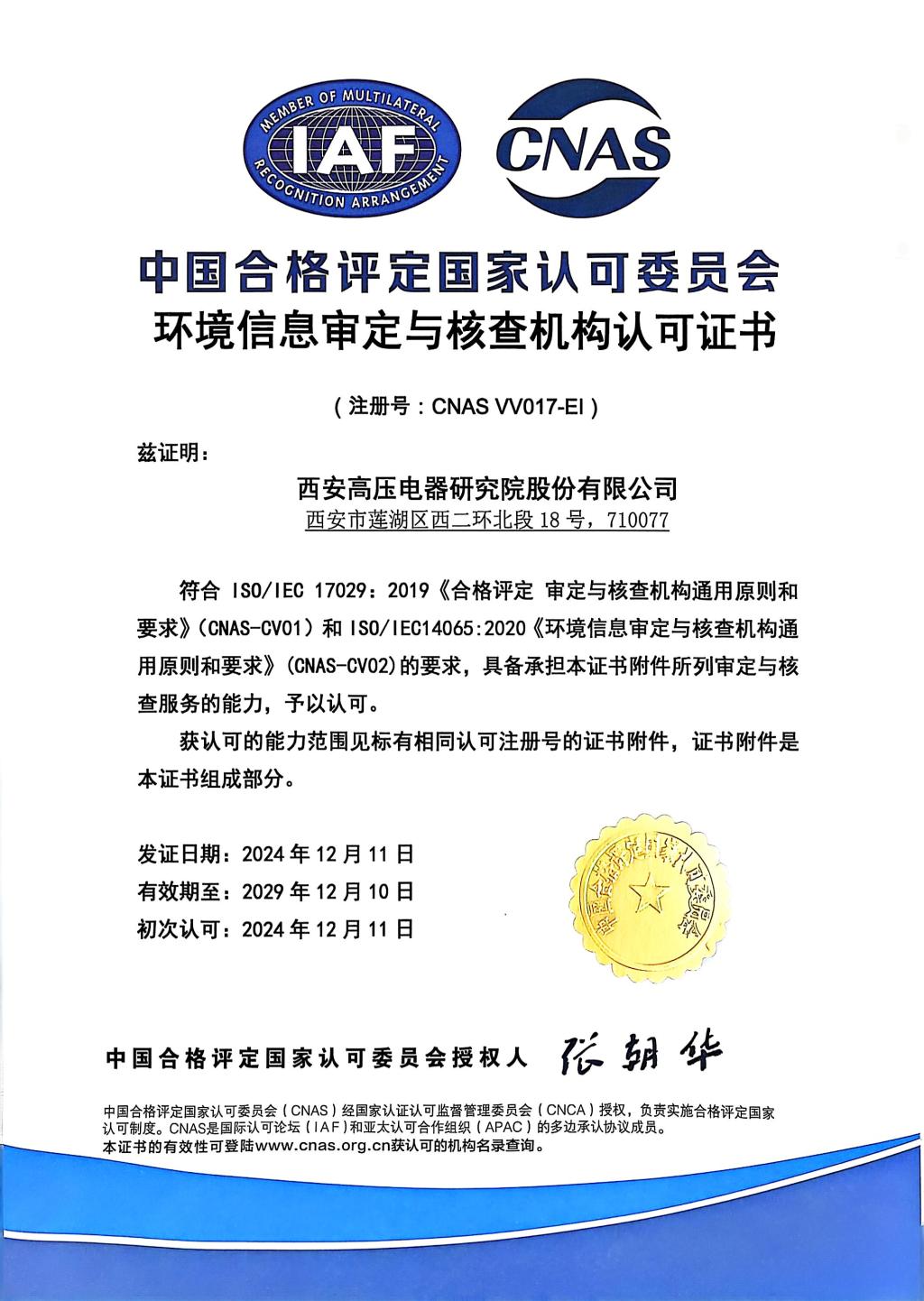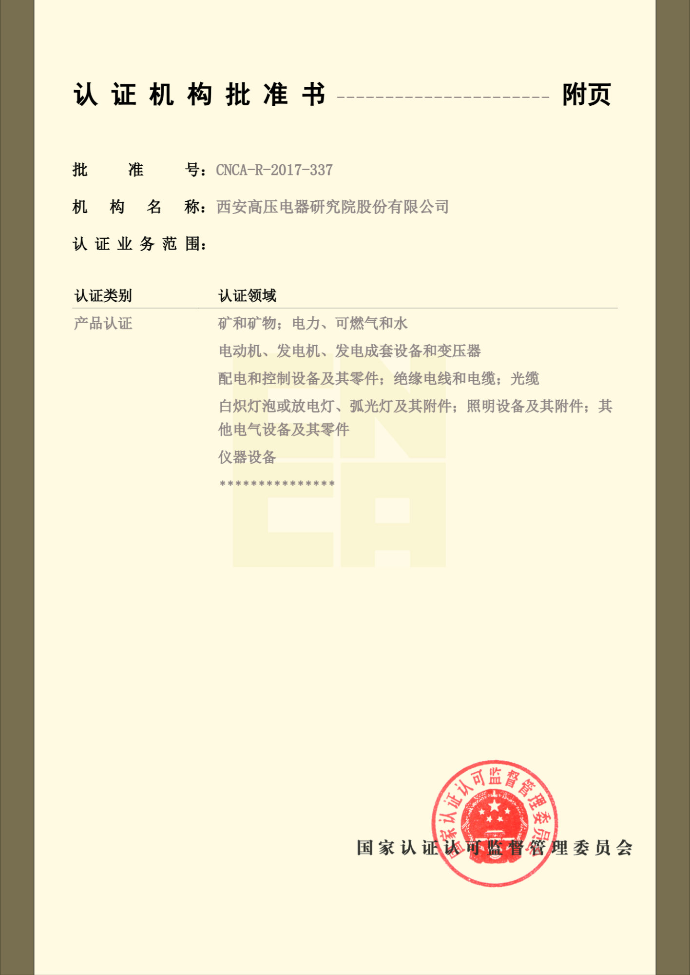 产品认证机构认可证书