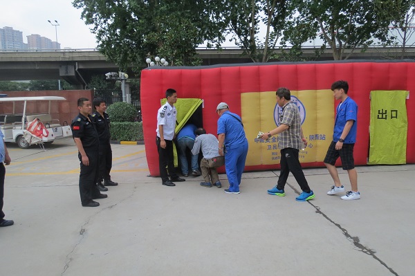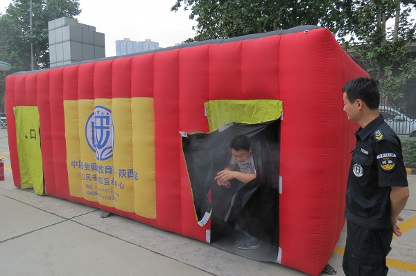 办公大楼前搭建了消防模拟“逃生帐篷”,安技保卫处组织参与活动人员到达弥漫浓烟的逃生帐篷外,首先,由专职教员讲解进入帐篷的注意事项,然后带领大家分批分次的进入帐篷开启体验之旅,帐篷内设有隔断墙,将内部分隔成迂回曲折的走道空间,为迷宫形式,并分开设置1个进口和1个出口,进出口上设有遮光用的门帘,具有封闭、黑暗、浓烟等特点,每个人在烟雾缭绕的模拟帐篷内真实的感受着火灾发生时的现场状态。“蹲下、捂鼻子、按照帐篷内的标识找出口……”在浓烟密布的模拟帐篷内,专职教员指导着所有人员“火里逃生”。
