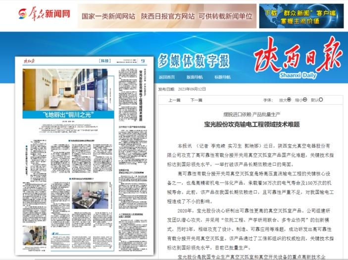 习近平总书记指出,创新作为引领发展的第一动力,坚持创新在我国现代化建设全局中的核心地位,深入实施创新驱动发展战略,建设科技强国。近日,中国西电集团所属宝光集团所研制的高可靠性有载分接开关用真空灭弧室产品,关键技术指标达到国际领先水平。陕西日报聚焦西电努力攻克技术国产化难题,一举打破该产品长期依赖进口的局面。