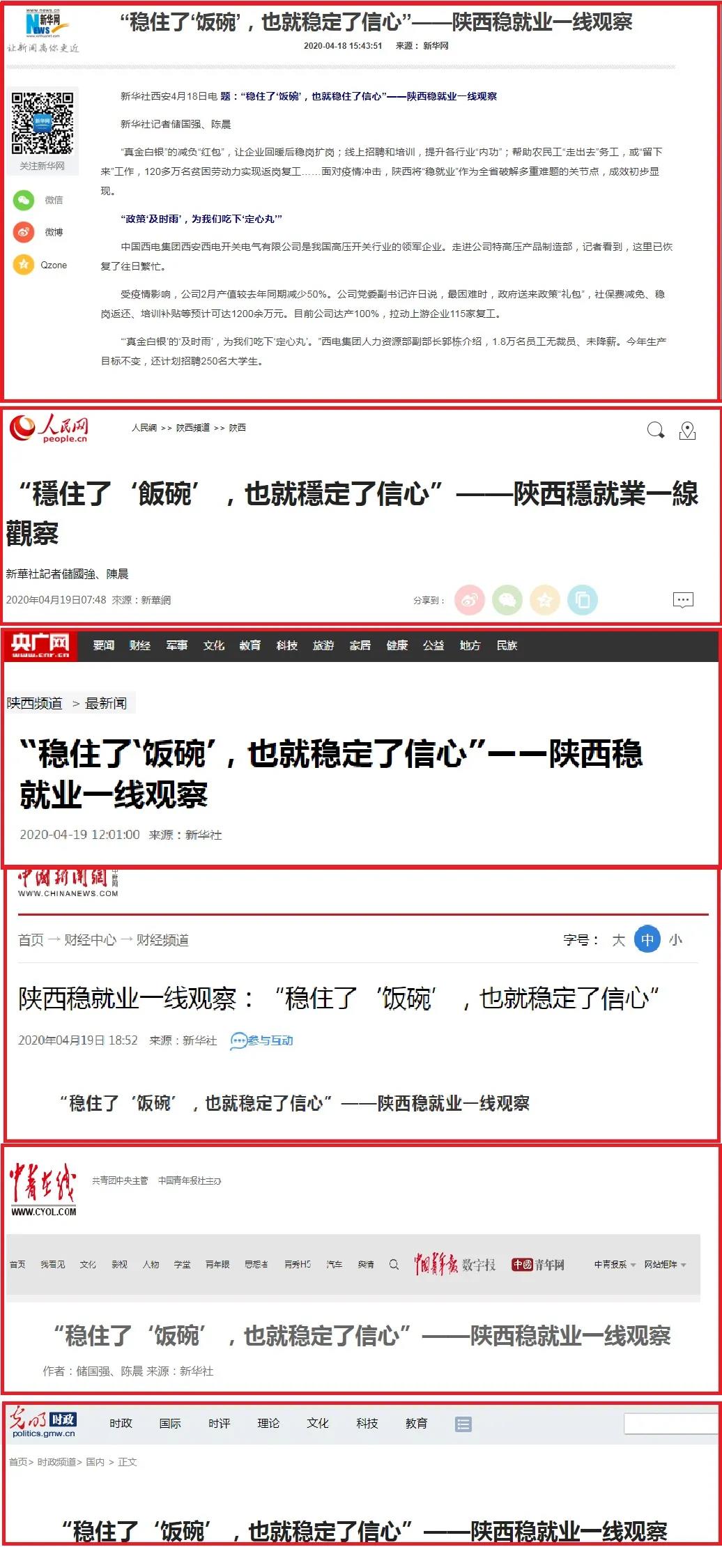 近日,新华社发布,人民网、央广网、中国新闻网、中青在线、光明网等多家媒体纷纷转发了《“稳住了‘饭碗’,也就稳定了信心”》一文,学习强国学习平台发布了《中国西电集团五大具体举措“稳岗扩就业”》一文,共同报道了中国西电集团认真贯彻落实习近平总书记关于稳就业的重要讲话精神,积极履行央企责任,扎实做好疫情防控期间稳岗扩就业工作的具体实践。