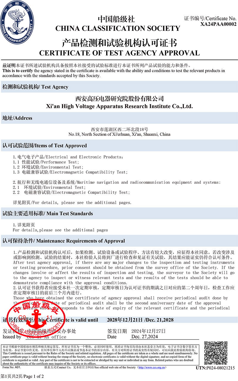 中国船级社产品检测和试验机构认可证书