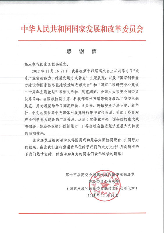 国家发改委就“高压电气国家工程实验室”全力支持参加第十四届高交会发来感谢信