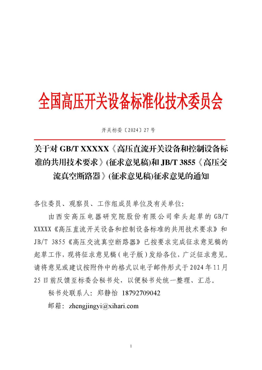关于对 《高压直流开关设备和控制设备标准的共用技术要求》和 《高压交流真空断路器》征求意见的通知.pdf