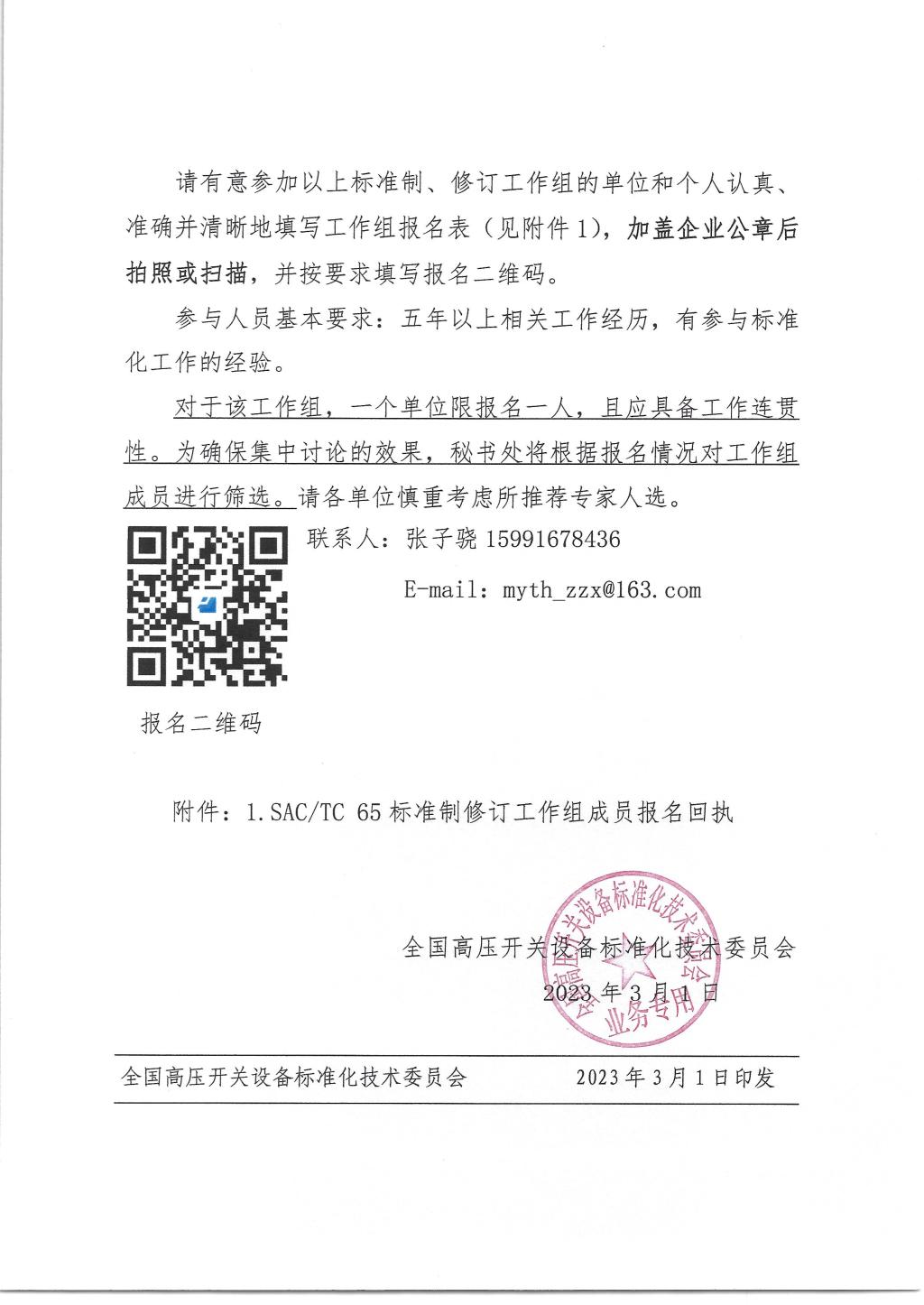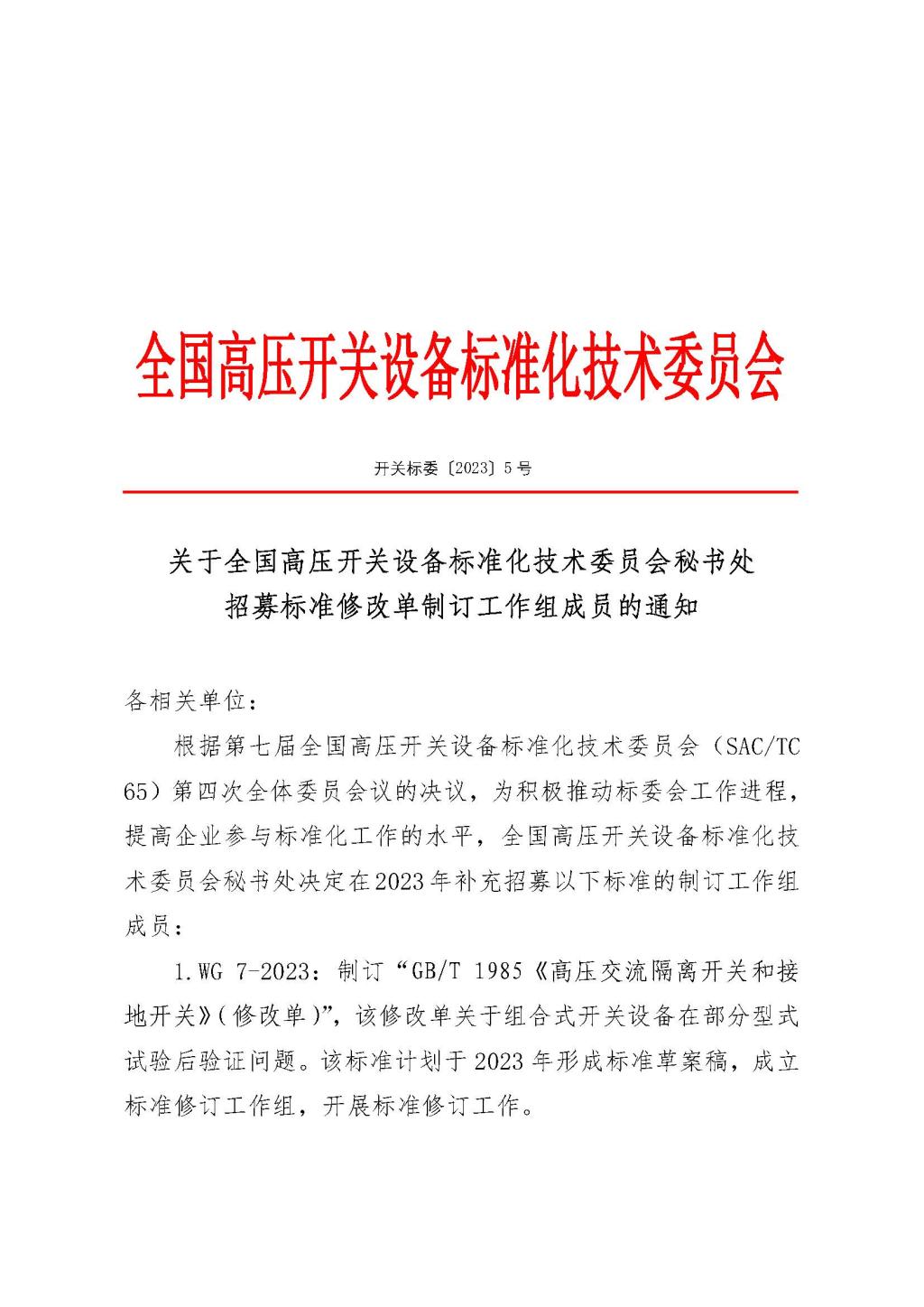 关于全国高压开关设备标准化技术委员会秘书处招募标准修改单制订工作组成员的通知