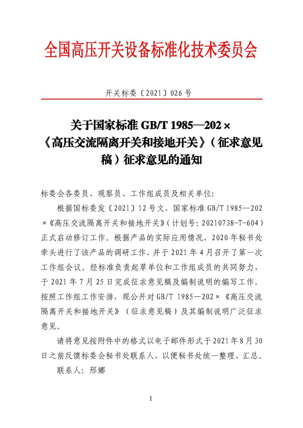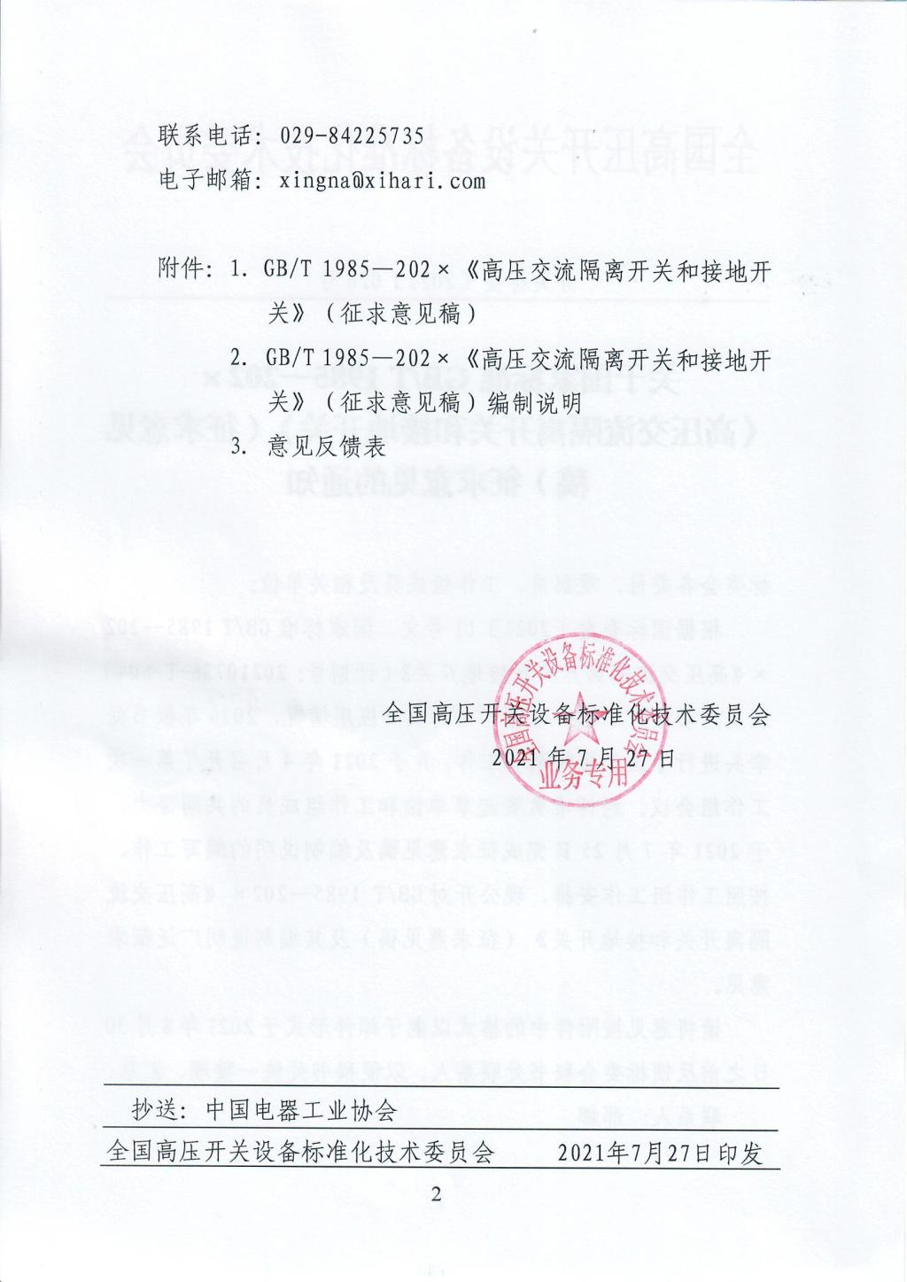 关于国家标准GB/T 1985—202× 《高压交流隔离开关和接地开关》(征求意见稿)征求意见的通知