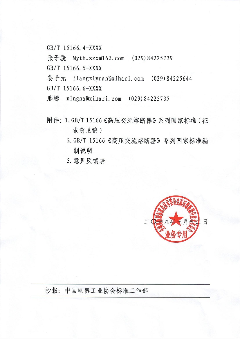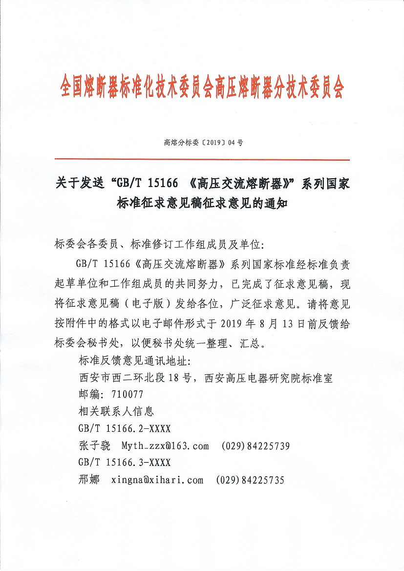 关于发送“GB/T 15166 《高压交流熔断器》”系列国家标准征求意见稿征求意见的通知
