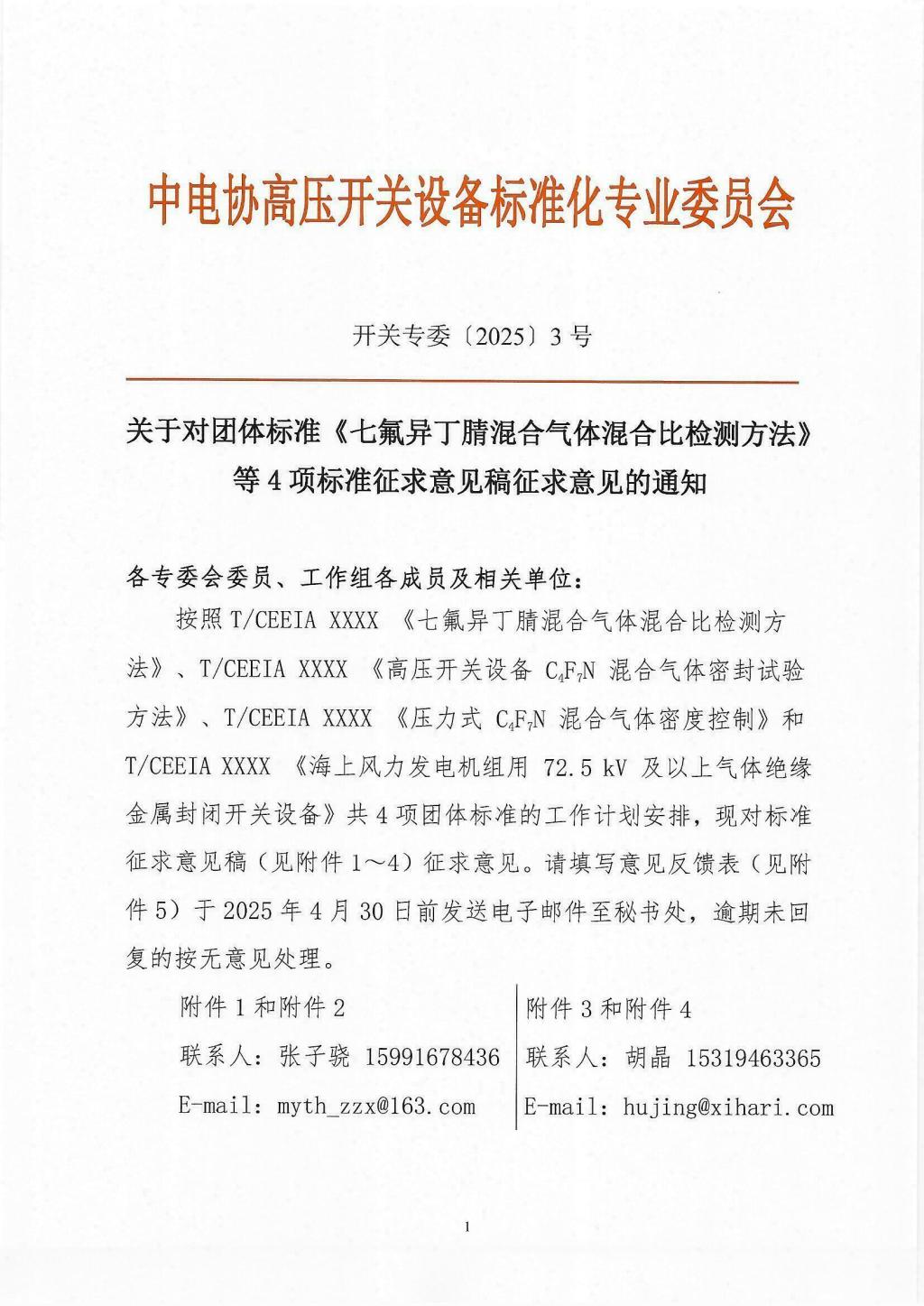 关于对团体标准《七氟异丁腈混合气体混合比检测方法》等4项标准征求意见稿征求意见的通知