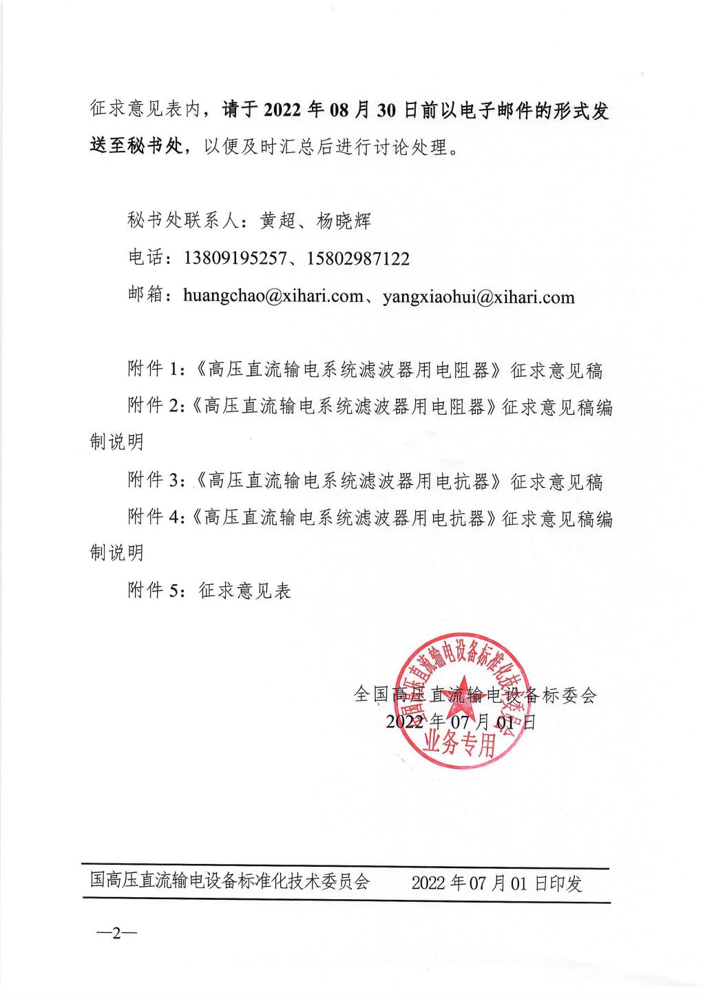 关于《高压直流输电系统滤波器用电阻器》、《高压直流输电系统滤波器用电抗器》两项标准征求意见的通知