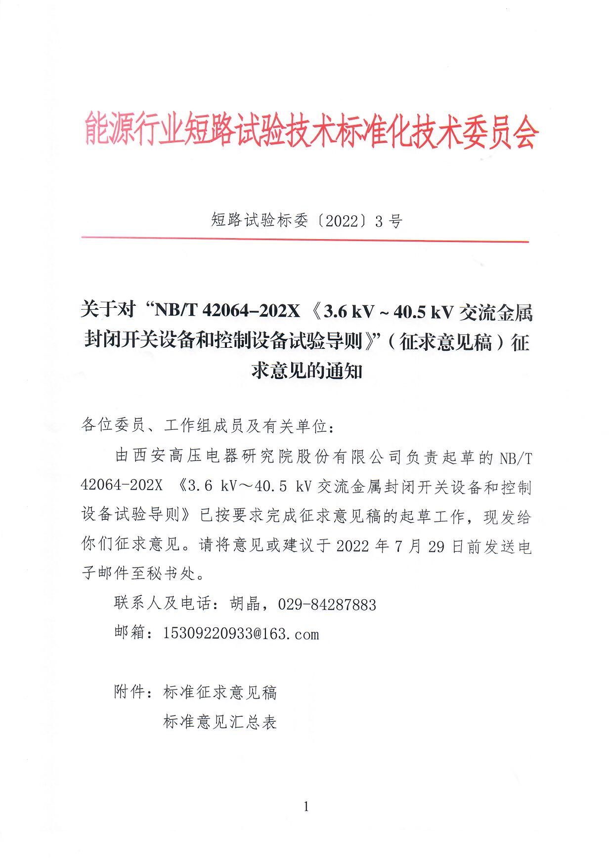 关于对“NBT 42064-202X 《3.6 kV~40.5 kV交流金属封闭开关设备和控制设备试验导则》”(征求意见稿)征求意见的通知