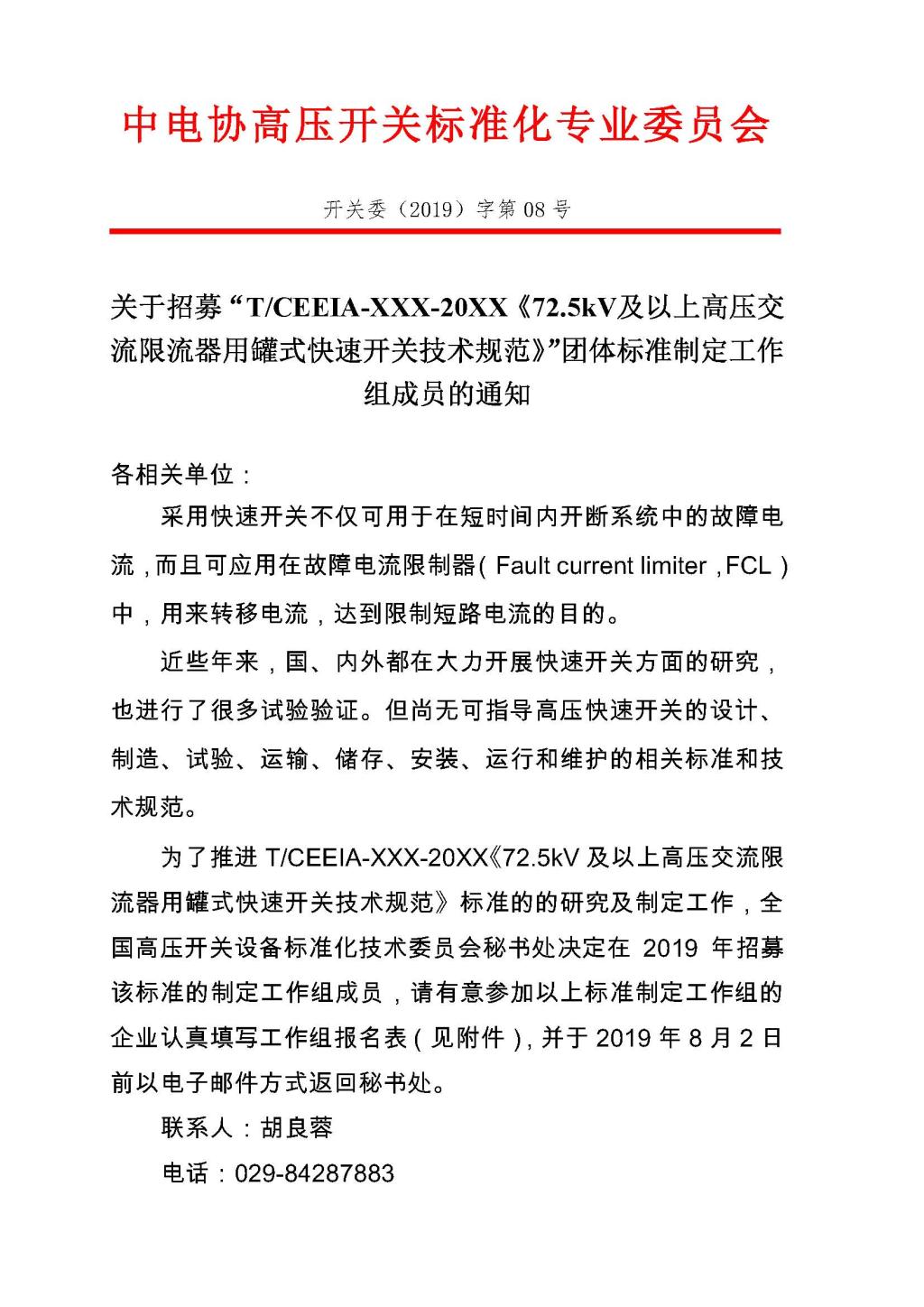 关于招募“T/CEEIA-XXX-20XX《72.5kV及以上高压交流限流器用罐式快速开关技术规范》”团体标准制定工作组成员的通知