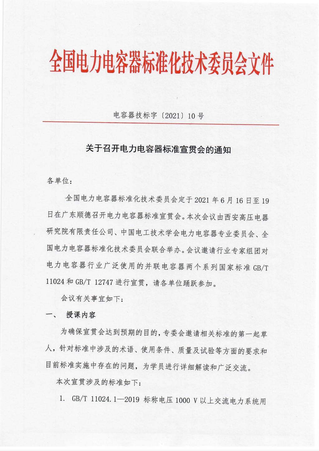 电容器技标字【2021】10号—关于召开电力电容器标准宣贯会的通知