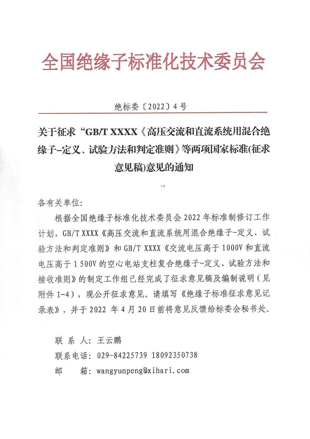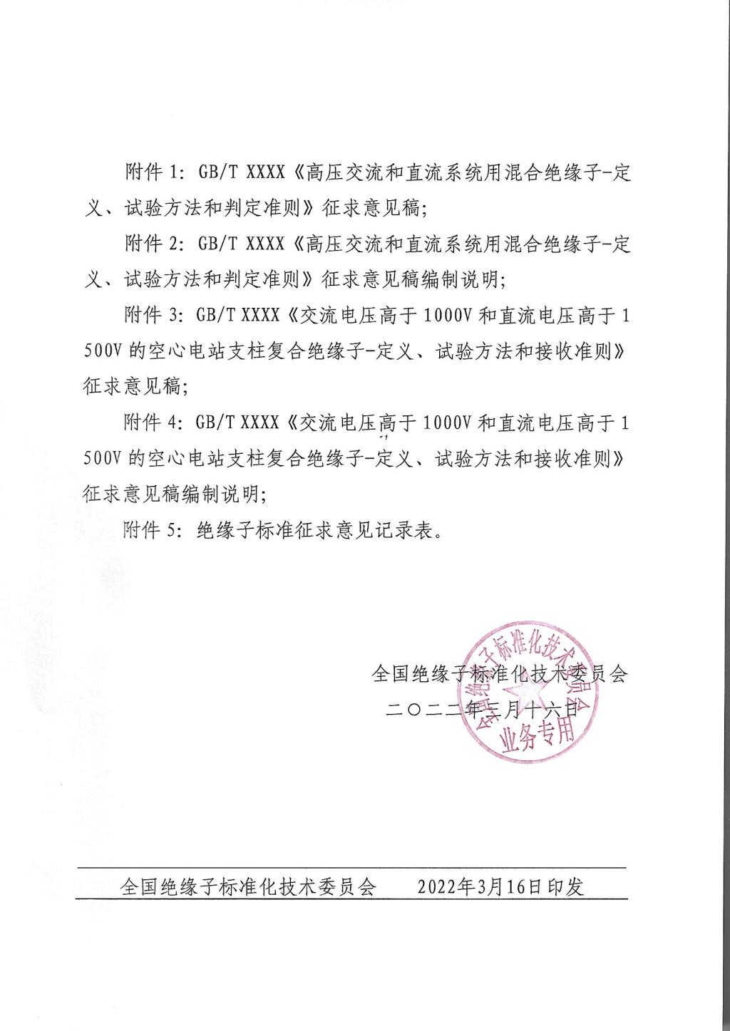 关于征求“GBT XXXX《高压交流和直流系统用混合绝缘子-定义、试验方法和判定准则》等两项国家标准征求意见稿
