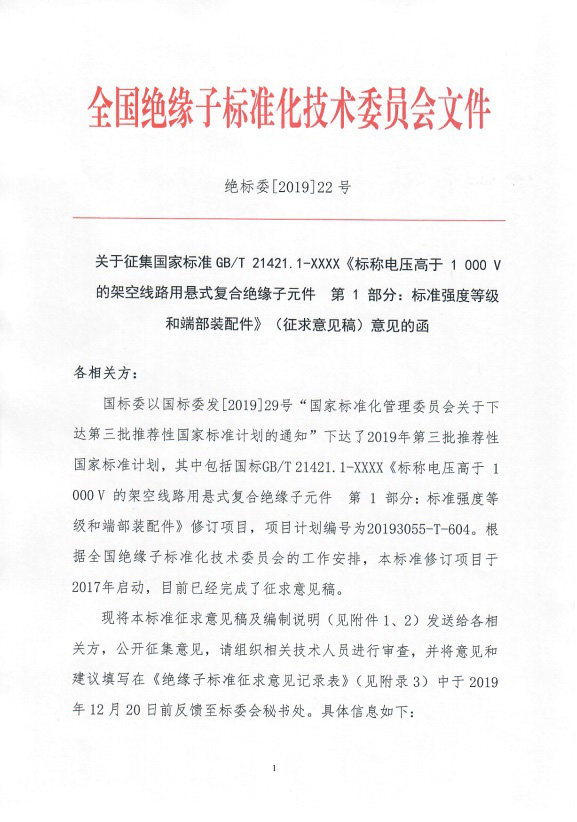 征集国家标准GB/T 21421.1-XXXX《标称电压高于 1 000 V 的架空线路用悬式复合绝缘子元件 第 1 部分:标准强度等级和端部装配件》(征求意见稿)意见