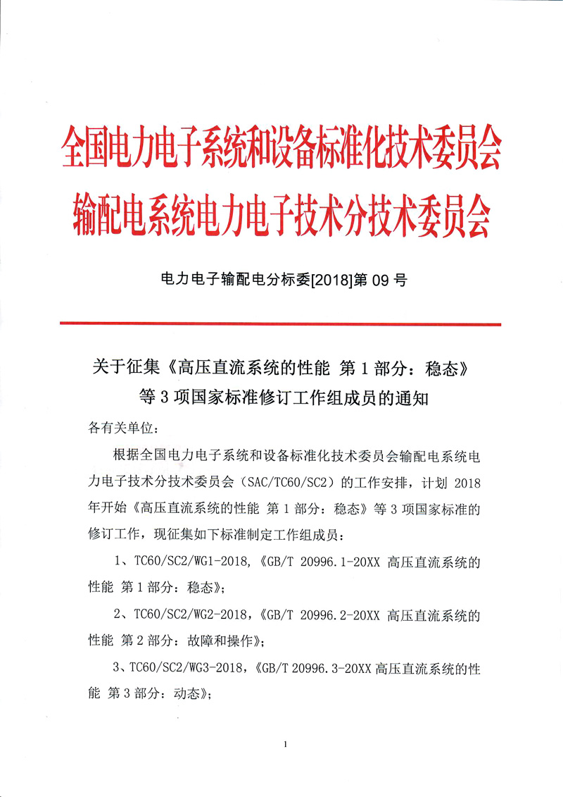 关于征集《高压直流输电晶闸管阀_第1部分:电气试验》等2国家标准修订工作组成员的通知
