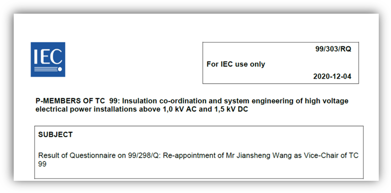 近日,国际IEC发布了99/303/RQ号文件,文件宣布IEC/TC99技术委员会全票通过我院王建生博士连任IEC/TC99副主席,此届任期为2020-11-01至2023-10-31。