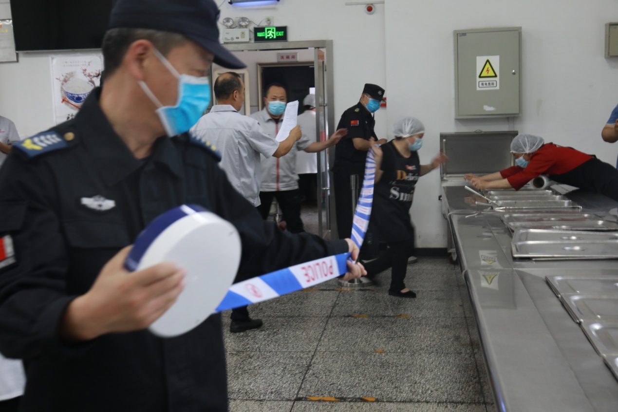 演练按照提前制定的应急预案,分工明确,在接到人员中毒的信息后,餐厅管理人员迅速反应,及时处置,向上级报告,并指导餐厅启动安全卫生应急响应程序,拨打“120”急救电话,有序组织人员将中毒员工送往医院救治,现场警戒组配合封锁就餐现场,拉起警戒线保持现场隔离。按程序封存登记就餐食品及食品留样,并将食品送往专业食品安检部门化验。随后,工会组织部分代表对餐厅的食品卫生、现场管理等内容进行了专门监督检查,提出了改进意见。