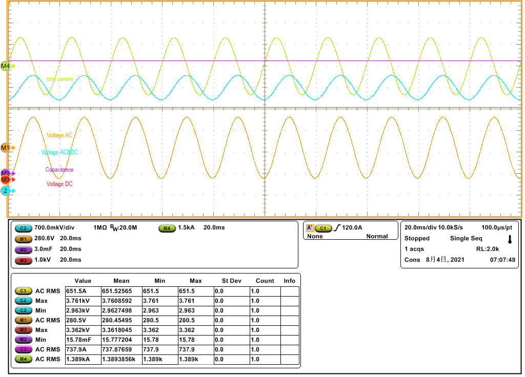 本次试验是国网特高部组织,联合经研院、联研院、电科院及国内外厂家开展的柔性直流输电工程关键部件直流支撑电容器性能参数摸底工作,也是此类电容器国产化的先期预研工作。电能质量试验人员在充分分析试验技术要求和现场试验条件的基础上,改造现有回路,圆满地完成了此次试验验证工作。