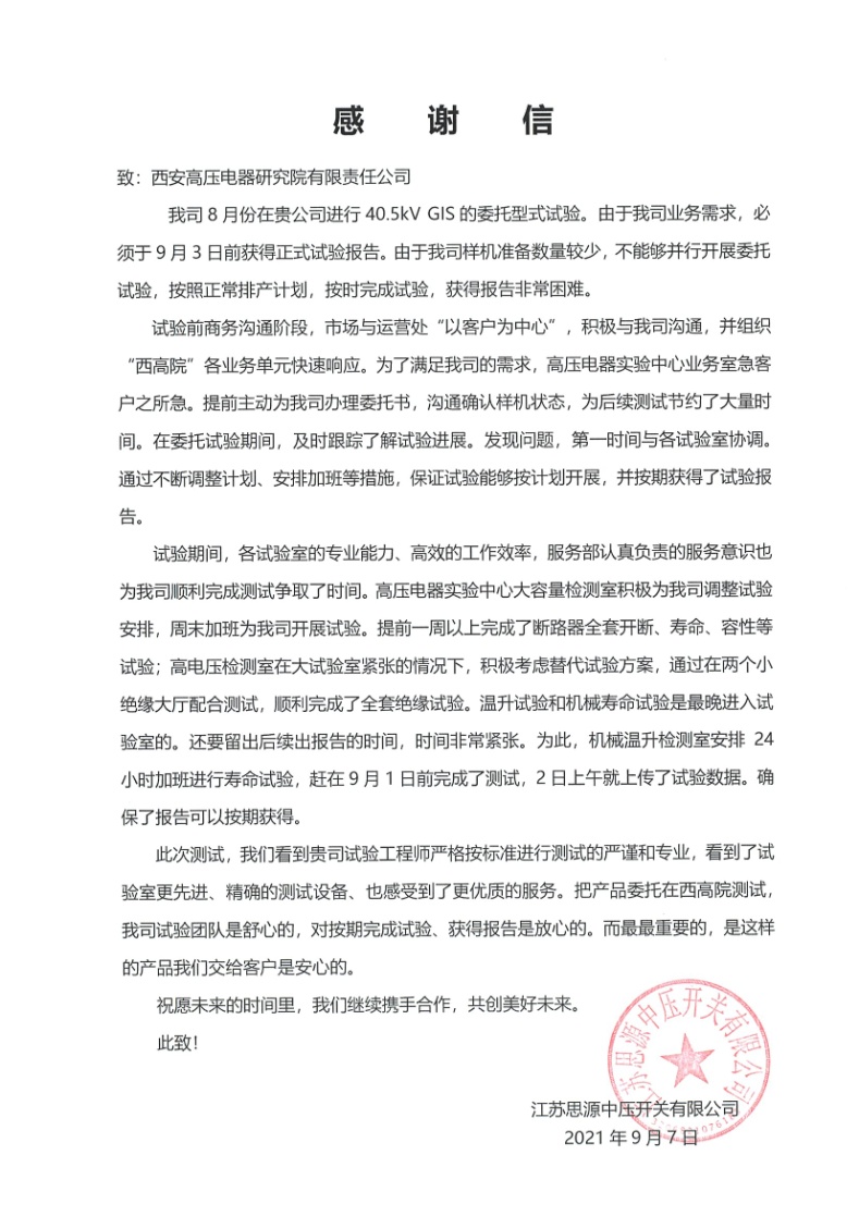近日,我院收到来自江苏思源中压开关有限公司发来的感谢信,信中对我院高压电器实验中心积极受理40.5kV气体绝缘金属封闭开关设备委托,分秒必争进行试验,如期为其出具检测报告表示感谢。