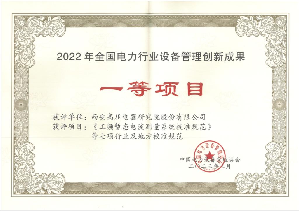 近日,由我院计量室申报的《工频暂态电流测量系统校准规范》等七项行业及地方校准规范荣获2022年全国电力行业设备管理创新成果一等项目。该项目中有六项技术规范为工业和信息化部管理的行业校准规范,一项技术规范为陕西省市场监督管理局管理的地方校准规范,目前,此七项技术规范均已发布实施。