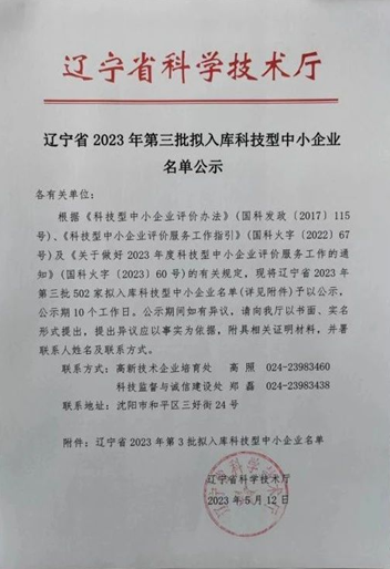 根据辽宁省科学技术厅下发的《辽宁省2023年第三批入库科技型中小企业公示》,沈变院正式入库科技型中小企业。