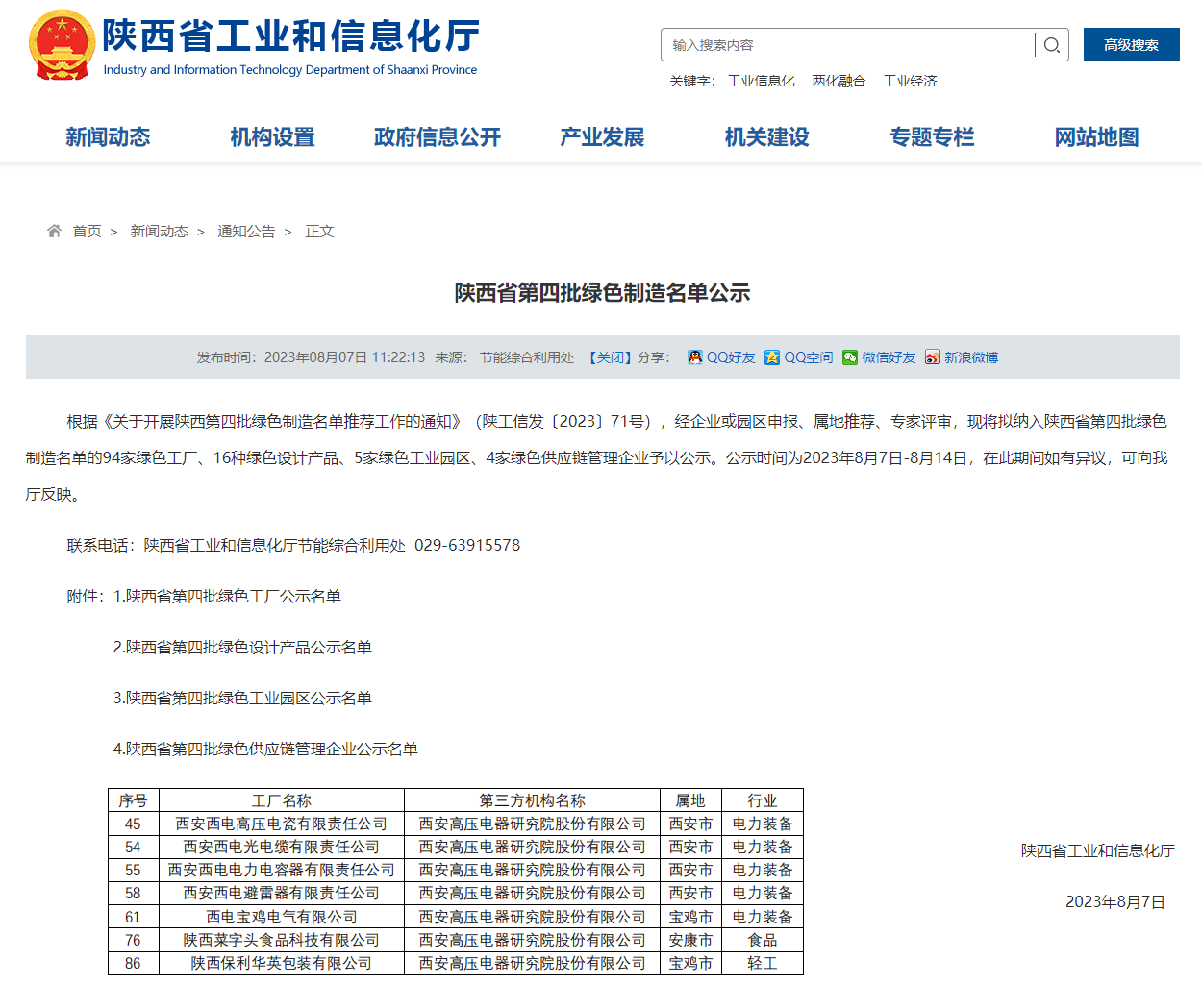 近日,陕西省工业和信息化厅公示了陕西省第四批绿色制造名单,其中由投注