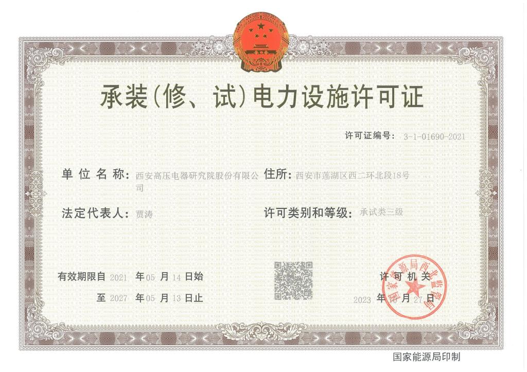 近日,我院顺利通过国家能源局西北监管局承装(修、试)电力设施资质升级申请的审查,成功取得承试电力设施许可资质(三级)资质证书,标志着我院自此可从事110kV及以下电压等级电力设施的现场试验业务,对提升我院市场竞争力具有十分重要的意义。