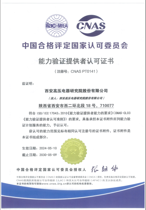 成功获得符合ISO/IEC 17043(CNAS-CL03)的能力验证提供者的CNAS认可资质(注册号:CNAS PT0141)。该资质是一项国际互认的重要认证,旨在为检验检测机构提供技术能力评价服务。我院可提供的能力验证范围包括回路电阻、工频电压试验能力验证共计2个项目/参数。
