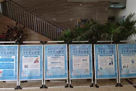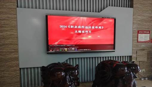 在公司办公楼大厅大屏上,循环播放着 2024 年度职业病防治法宣传周主题宣传片,吸引了众多员工的关注,让大家对职业病防治有了更深刻的认识。办公楼内布置摆放了一系列职业健康宣传海报,形象生动地展示了职业病防治的重要性和方法,使员工在日常工作中能够随时受到教育和提醒。公司主干道上拉起了“坚持预防为主,守护职业健康”的横幅,鲜明的标语时刻提醒着每一位员工关注职业健康。