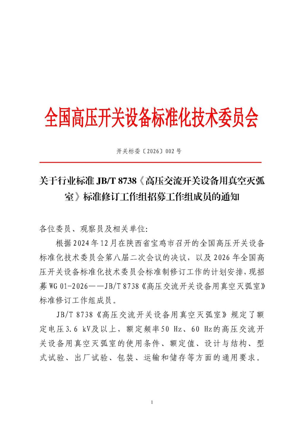 关于行业标准JBT 8738《高压交流开关设备用真空灭弧室》标准修订工作组招募工作组成员的通知