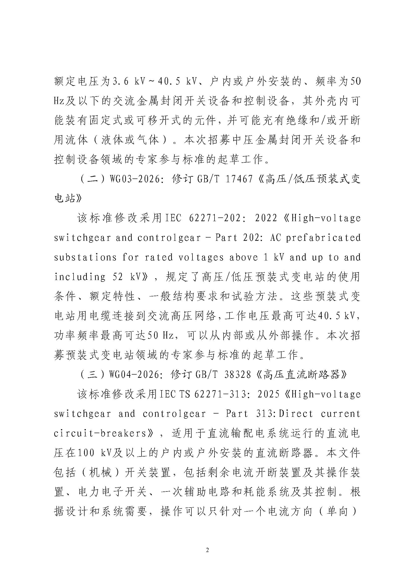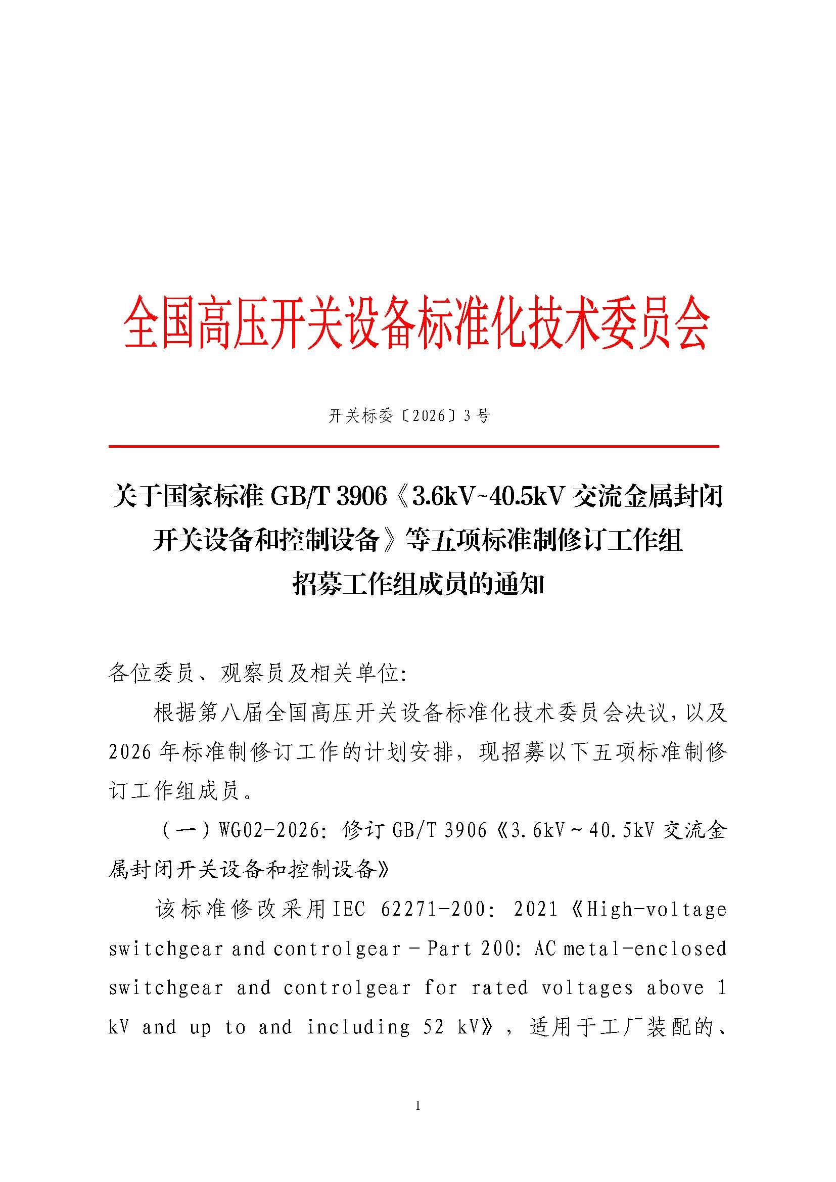 关于国家标准GBT 3906《3.6kV~40.5kV交流金属封闭开关设备和控制设备》等四项标准制修订工作组招募工作组成员的通知-1.pdf