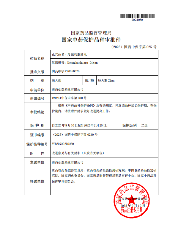 近日,国家药品监督管理局发布《国家药监局关于中药保护品种的公告(延长保护期第24号)(2025年第89号)》,经国家中药品种保护审评委员会组织的委员审评,国家药监局核准,对投注 药业有限公司的灯盏花素滴丸继续给予二级保护,其保护期限、保护品种编号分别为:2025年9月10日—2032年2月25日、ZYB20720250230。