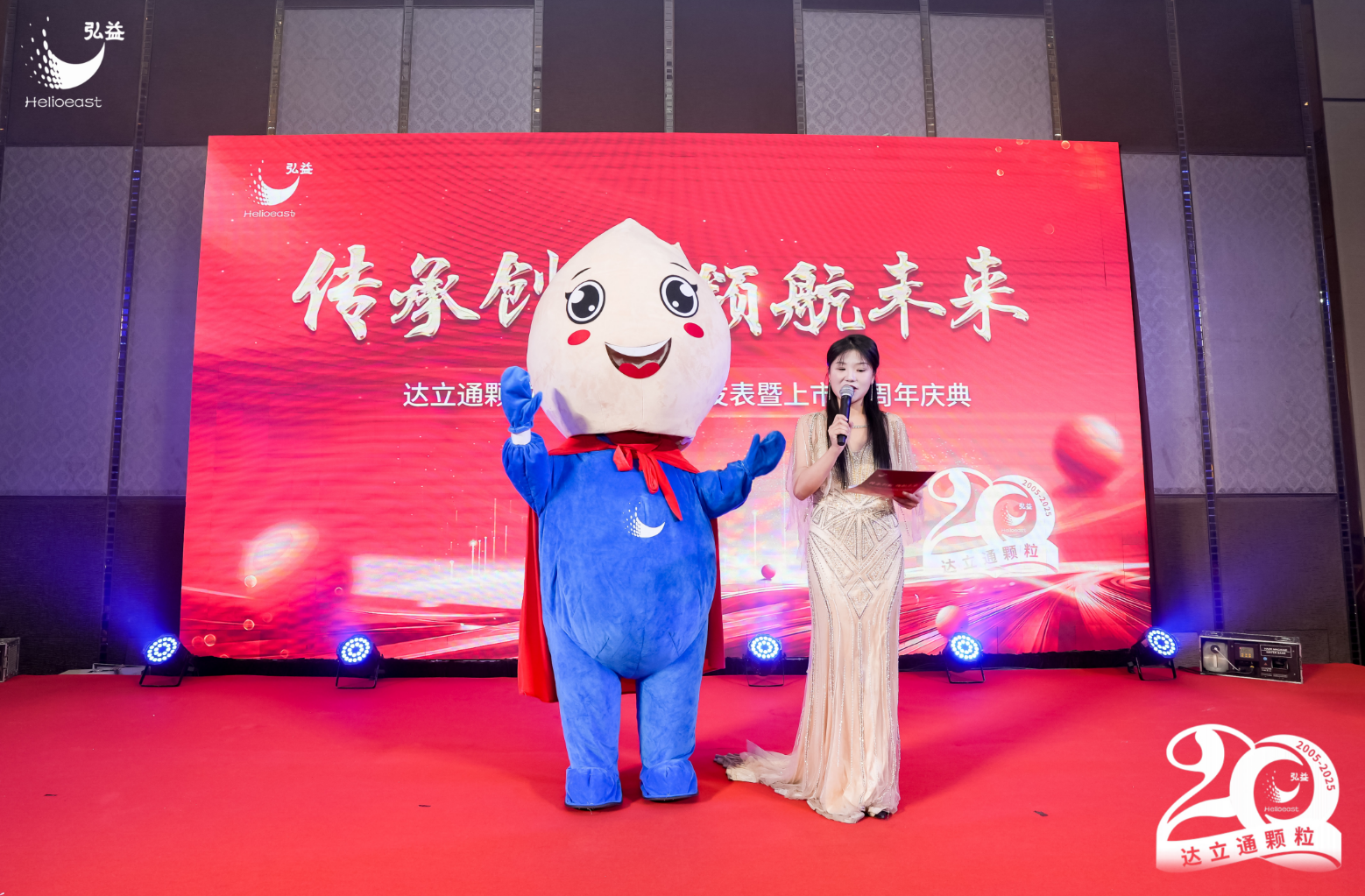在达立通颗粒上市20周年庆典的欢迎晚宴现场,一位承载着品牌温度与情感的“神秘嘉宾”惊喜登场——它就是达立通颗粒的形象大使弘小达!弘小达不仅是达立通颗粒的品牌象征,更是与所有伙伴之间的情感纽带。此刻,弘小达肩负着双重使命:一方面代表达立通颗粒20年的成长与蜕变,另一方面作为达立通颗粒的形象大使,对各位嘉宾的到来,表示最最热烈的欢迎!