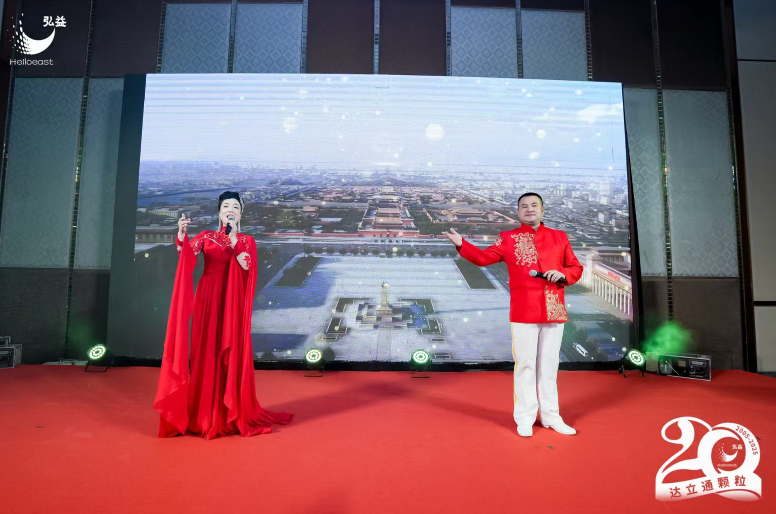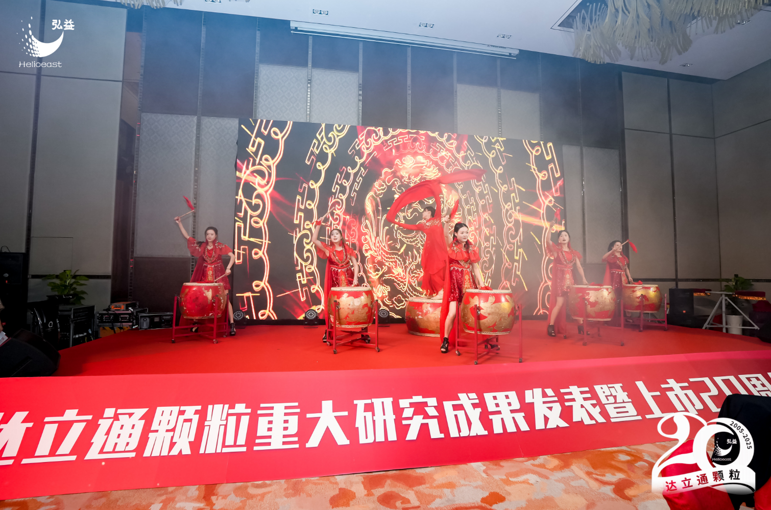 晚宴在气势恢宏的开场舞《盛世龙鼓》中震撼拉开序幕。鼓手们身姿矫健,鼓槌上下翻飞,鼓声如雷,似滚滚春雷唤醒大地生机,又似激昂战歌奏响胜利号角。舞者们身着华服,舞姿飒爽,如蛟龙出海、似凤凰展翅,瞬间点燃现场气氛,象征着达立通颗粒20年来如龙腾九天般蓬勃发展、昂扬向上的姿态。