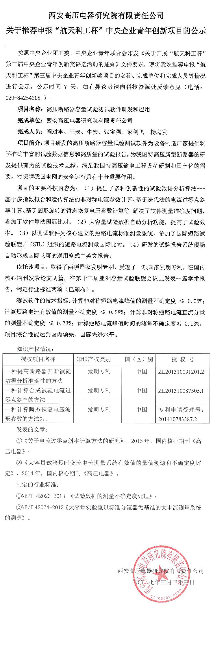 西安高压电器研究院有限责任公司关于推荐申报“航天科工杯”第三届中央企业青年创新奖项目的公示